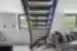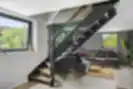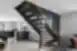 Modernūs ąžuoliniai laiptai su pilkai tonuotu stiklu ir juodomis tvirtinimo detalėmis. LED apšvietimas porankyje suteikia namams modernumo.