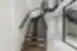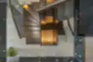 Modernūs laiptai su centrine metalo sija ir pilkai tonuotu stiklo turėklu – subtilus, šiuolaikiškas akcentas interjere.
