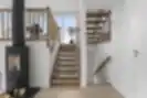 Standartiniai ąžuoliniai laiptai su šonine laiptasija. Atviros pakopos su vaikų apsauga. Subtili AMC Smoke spalva.