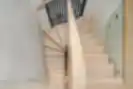 Stiklinis turėklas, montuojamas iš šono, pabrėžia karpytų laiptasijų formą. Tai stilingas ir šiuolaikiškas pasirinkimas jūsų namams.