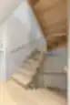 Stiklinis turėklas, montuojamas iš šono, pabrėžia karpytų laiptasijų formą. Tai stilingas ir šiuolaikiškas pasirinkimas jūsų namams.